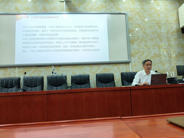 李树清带领师生党员回顾了我党高度重视作风建设的历史,阐释了中央八项规定具体内容和精神实质,详细解读了中央八项规定精神的核心要义与时代价值。他指出,加强对中央八项规定精神等重要内容的学习,是师生党员坚定理想信念、保持政治本色的必然要求,对营造风清气正的政治生态具有重要意义。