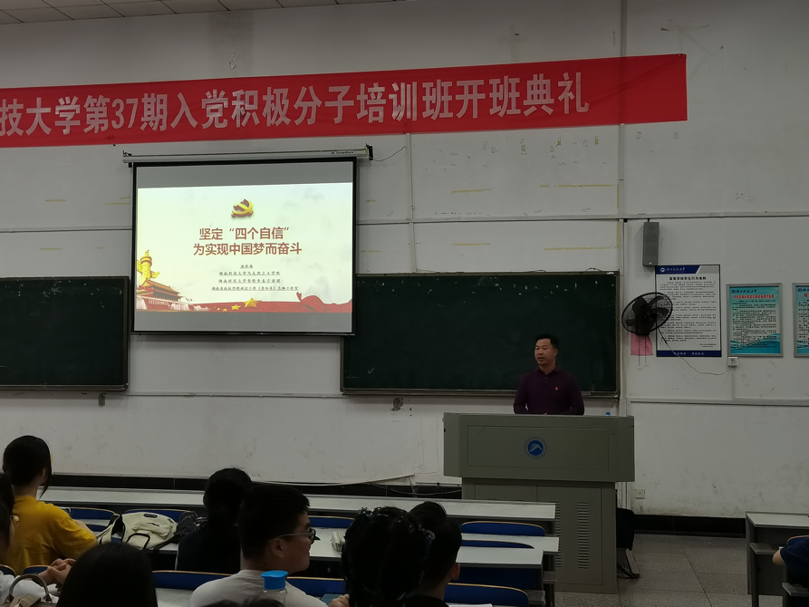 唐佳海此次党课分别以“中国梦”、“四个自信”、“做自信的时代新人”三个方面向全体学员授课。中国梦具体表现是国家富强、民族振兴、人民幸福。他希望全体学员都能将个人梦想与中国梦相结合,创造国家美好未来。“四个自信”分别为道路自信、理论自信、制度自信、文化自信。要实现中国梦就要坚持“四个自信”。他鼓励全体学员做自信的时代新人才能与时代同行,与祖国共进。在授课接近尾声时,唐佳海向各位入党积极分子介绍了党的组织机构、中国共产党的纪律与作风建设,帮助大家清楚应以什么样的标准来规范自己。