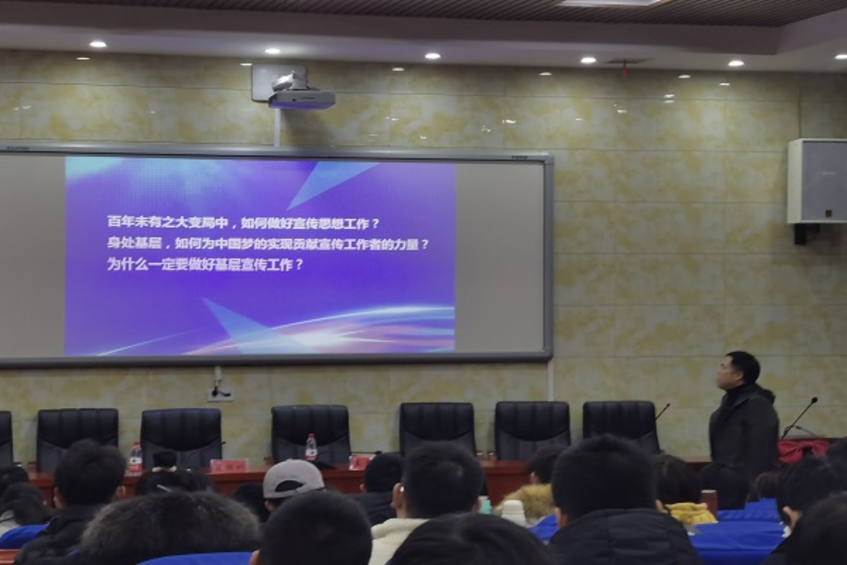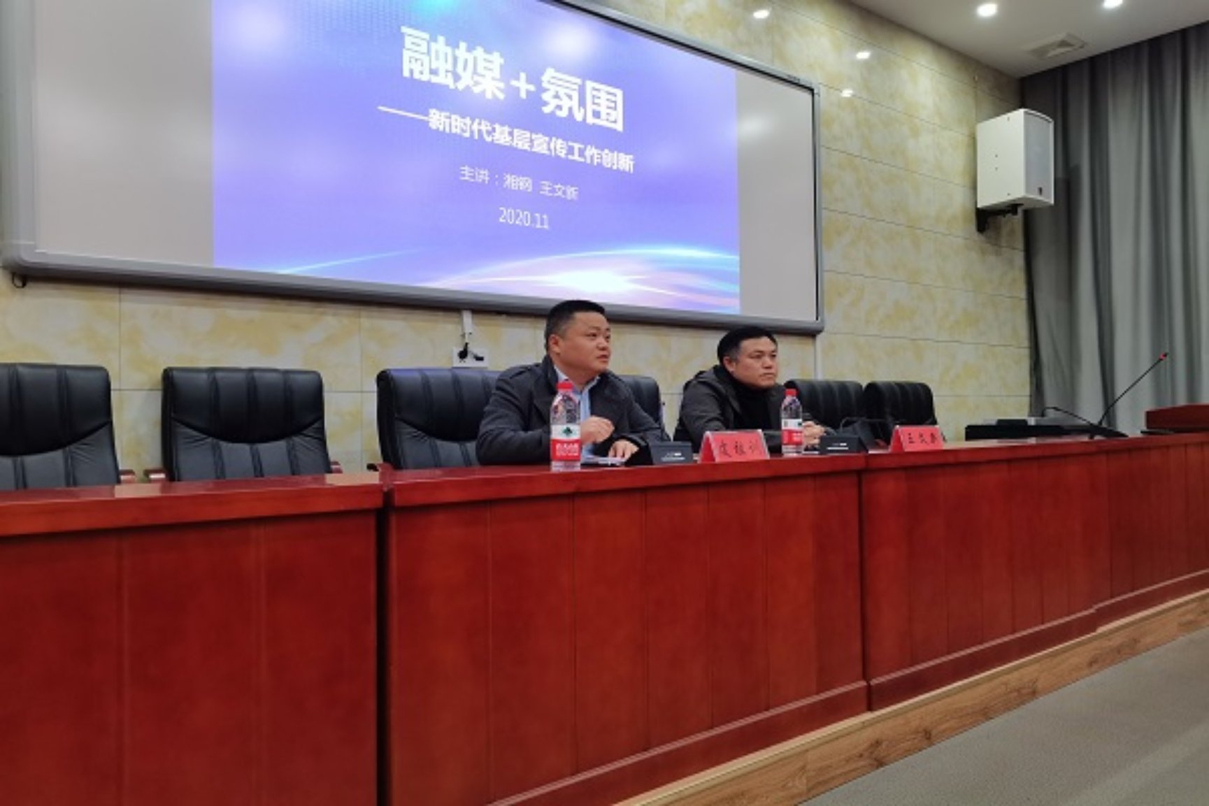 为全面加强学院宣传队伍建设,提高宣传工作水平,增强宣传意识和写作能力,着力打造一支政治敏锐、立场坚定、作风务实、敢于担当、奋发有为的宣传思想文化队伍,11月28日下午15:00,学院邀请湘钢融媒体中心主任兼湘钢电视台台长、湘钢报社社长王文新于学院学术报告厅开展了以“融媒+氛围”为主题的报告会。会议由院党委副书记皮祖训主持,院团委书记吴汉,就业辅导员苏俊铭,院团委、学生会各部门负责学生干部参加会议