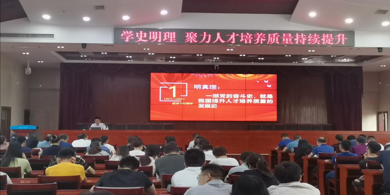 2021年6月22日下午16:30,校党委委员周智华在立德楼五楼报告厅讲授“学史明理,聚力人才培养质量持续提升”专题党课,学校相关部门与学院各党支部党员与会。