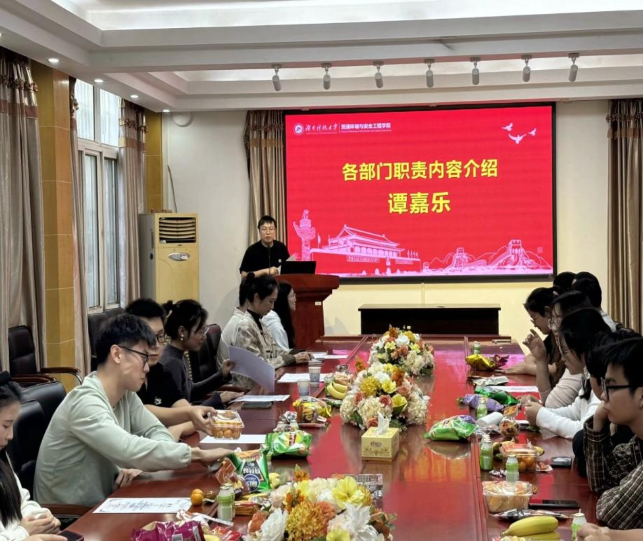 再次,第二十一届研究生学生会执行主席谭嘉乐介绍各部门职责内容并作新一年的工作规划;最后,学院党委副书记刘韧老师总结发言,欢迎大家加入团队的同时,也要传承老传统、继续努力,做好研究生干部榜样作用,构建和谐美好又积极向上的研究生学生会。
