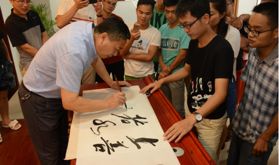 讲座结束后,王海桥教授拿出他准备好的笔纸为大家写毛笔字送给学员们当纪念礼物。“上善若水”“宁静致远”“厚德载物”,一幅幅书法作品中寄托了王海桥教授对大家真切的期望与祝福。