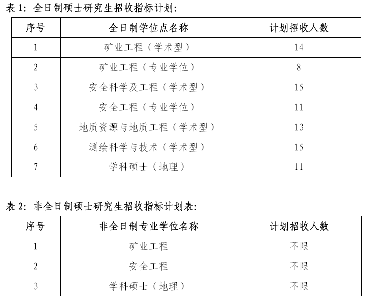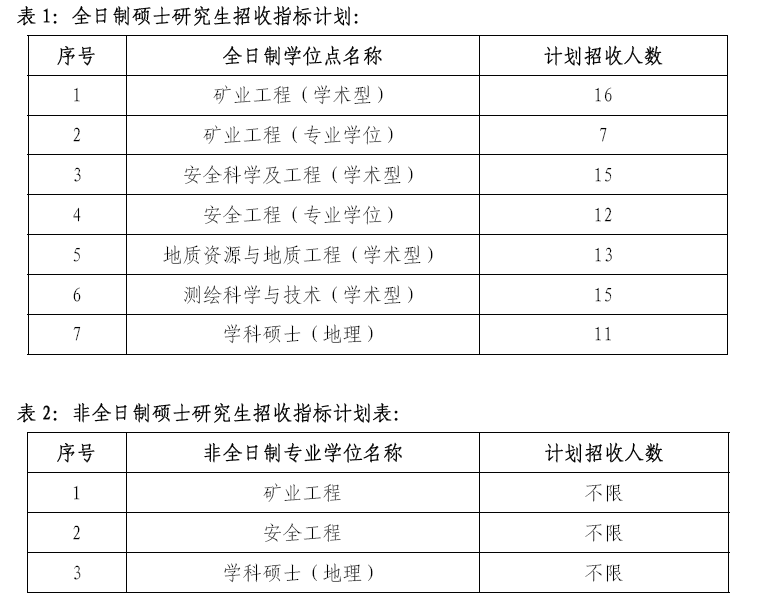 矿业工程、安全科学及工程、地质资源与地质工程、测绘科学与技术四个一级学位点预计共招收学术型硕士研究生59名;矿业工程(专硕)、安全工程(专硕)和学科硕士(地理)共计划招生30人。学院复试人数均按1.2倍以内的比例进行复试。