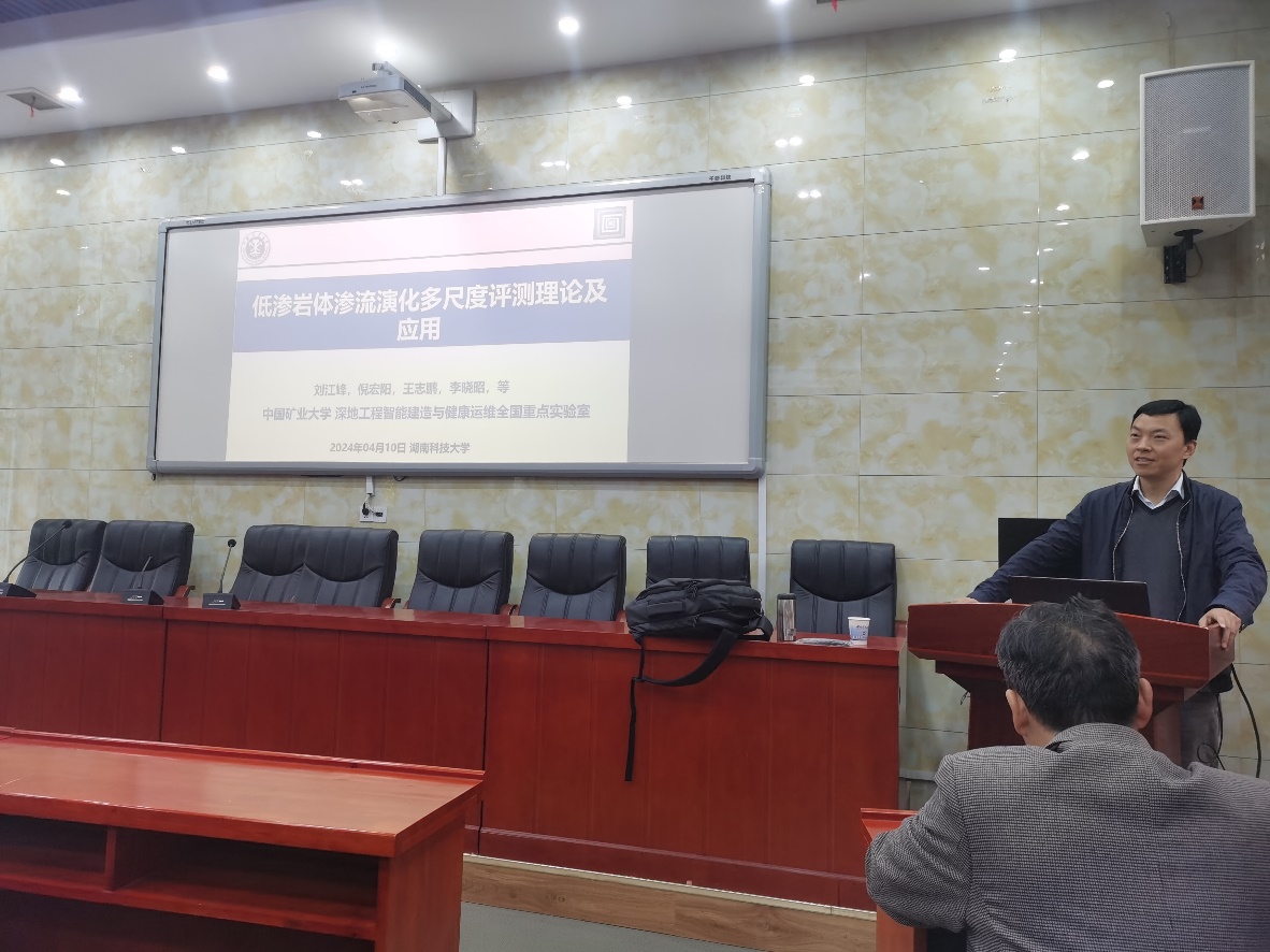 4月10日,应学院邀请,中国矿业大学国家级青年人才刘江峰教授来院作了题为《低渗岩体渗流演化多尺度评测基础理论及应用》的学术报告,副院长李青锋教授主持会议。