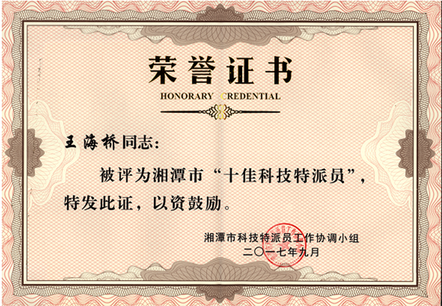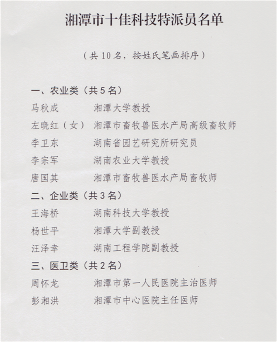 9月28日,湘潭市科技特派员工作座谈会在湘潭天易经开区举行。会上,副市长刘永珍宣读了关于评定湘潭市“十佳”科技特派员的情况通报,王海桥教授获评湘潭市十佳科技特派员。
