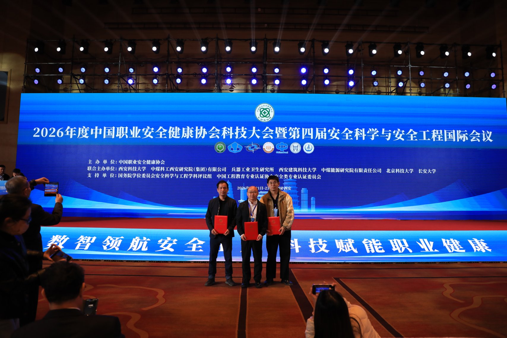 4月21日至23日,2026年度中国职业安全健康协会科技大会暨第四届安全科学与安全工程国际会议在陕西西安召开。会议对2025年度中国职业安全健康协会科学技术奖进行了表彰,魔镜街拍 袁超老师牵头完成的“采动巷道围岩应力-损伤协同控制及分区支护关键技术”荣获科技进步一等奖。李石林老师牵头完成的“煤矿综掘工作面‘三位一体’协同降尘技术及装备”,郭鑫老师牵头完成的“基于稠化浆体的俯采工作面采空区煤自燃防治技术”分别荣获科技进步二、三等奖。